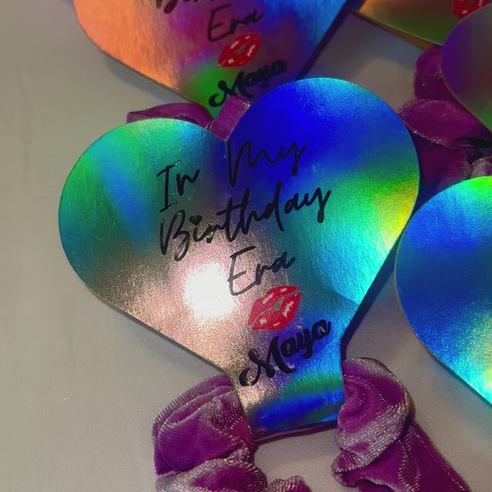 Make your little girl's birthday party a memorable and stylish event with the Birthday Era Scrunchie Favor. These hair scrunchies are perfect for girls who love to accessorize their hair while joining in the fun. With a holographic themed design, these scrunchies are the ideal party favor for any birthday party. Whether your party has a music tour or pastel era theme, these scrunchies will fit right in. They are also great as goodie bag fillers or as decorations for a Shimmer party. Get the Birthday Era Scrunchie Favor now and add a touch of style to your celebration.